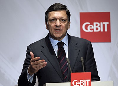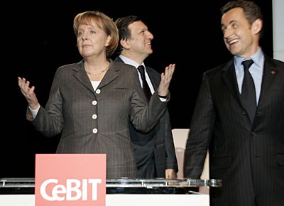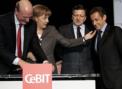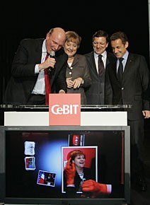 von 19: Der Vorstandsvorsitzende des US-amerikansichen Softwareherstellers Microsoft, Steve Ballmer (v.l.), Bundeskanzlerin Angela Merkel (CDU), der französische Präsident Nicolas Sarkozy und der Präsident der Europäischen Kommission, Jose Manuel Barroso, stehen in Hannover bei der Eröffnung der CeBIT 2008 gemeinsam auf der Bühne. (Foto: ddp)