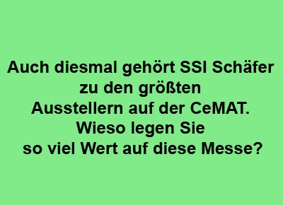 von 13: Die CeMAT nimmt auch in 2008 einen hohen Stellenwert in unserer Vertriebs- und Marketingstrategie ein, denn mit der Messe konnte für den Wirtschafts- und Wachstumsfaktor Intralogistik eine wichtige Plattform geschaffen werden. Neben ihrem Status als internationale Leitmesse fördert sie in hohem Maße die Innovationen und zeigt Trends auf zum Nutzen der Kunden. SSI Schäfer nutzt die CeMAT zur ganzheitlichen Darstellung der Innovationskraft und Leistungsstärke der Unternehmensgruppe. Auf dem über 2.500 Quadratmeter großen Messestand erleben Besucher Intralogistik live und können praxisnah und transparent das Zusammenspiel von Produktinnovationen bei Lager-, Förder- und Kommissioniertechnik direkt verfolgen.