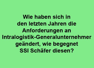 von 13: Innerhalb der Branche verstärkt sich die Nachfrage nach kundenindividuellen Gesamtlösungen. Unsere Kunden wollen maßgeschneiderte Lösungen aus einer Hand, die den hohen Anforderungen gerecht werden. Für SSI Schäfer ist das eine durchaus erfreuliche Entwicklung. Als Generalunternehmer betrachten wir seit jeher die Anforderungen des Kunden ganzheitlich und setzen auf Qualität, Innovation und Systemkompatibilität. Durch die Eingliederung von SSI Schäfer Noell und SSI Schäfer Peem sind alle Planungs-, Herstellungs- und Umsetzungsleistungen inklusive Service in einer marktführenden Unternehmensgruppe vereint – das ist es, was die Marke SSI Schäfer ausmacht.