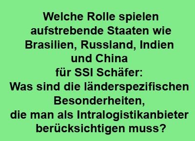 von 13: Aufstrebende Staaten wie Brasilien, Russland, Indien und China spielen für den Export von SSI Schäfer eine wichtige Rolle. Die Intralogistik ist schon seit langer Zeit kein nationales, sondern ein internationales Geschäft. Daher ist die internationale Kundenorientierung ein wesentlicher Bestandteil der Strategie von SSI Schäfer. Weltweit gewährleisten Gesellschaften und Vertretungen der SSI Schäfer-Gruppe in über 54 Ländern eine optimale Beratung vor Ort.