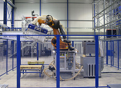 von 14: Der Depalletier-Roboter ist Bestandteil des automatischen Lager- und Kommissioniersystems Schäfer Case Picking (SCP). (Foto: SSI Schäfer)