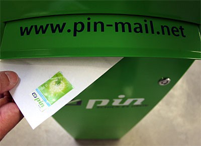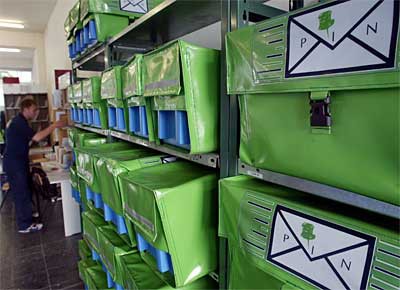 von 14: Donnerstag, 6. Dezember 2007 Nach dem Kompromiss für einen Post-Mindestlohn hat der private Briefzusteller Pin Group seine Entlassungsdrohungen wahrgemacht. Bei den Arbeitsagenturen sei die Kündigung von insgesamt 880 Mitarbeitern angezeigt worden, wie die Pin Group heute in Berlin mitteilte. Betroffen seien zunächst 100 Mitarbeiter in Hamburg, 230 in Niedersachsen, 250 in Hessen und 300 in Nordrhein-Westfalen. Geprüft würden weitere Personalmaßnahmen bei den Pin-Gesellschaften in Bayern sowie in anderen Bundesländern. (Foto: ddp)