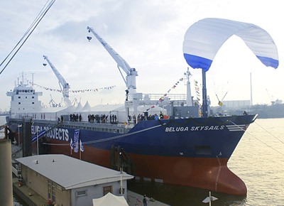 von 22: Montag, 21. Januar 2008 Neues Kapitel im Weltseeverkehr: Auf der Nordsee bei Bremerhaven wurde zum ersten Mal ein Frachtschiff-Neubau mit dem Windantrieb des Hamburger Herstellers SkySails gezogen. Ab Dienstag wird ein Frachter zur Überwindung der rund 9.600 Kilometer langen Seestrecke bis zum Zielland Venezuela neben der Motorkraft auch die Windkraft mitnutzen. (Foto: SkySails)