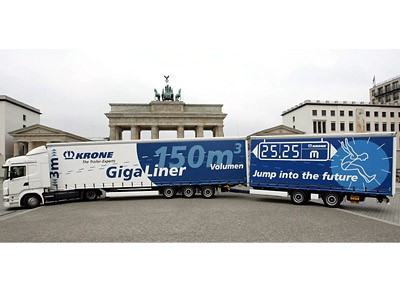 von 22: Mittwoch, 23. Januar 2008 Das Land Nordrhein-Westfalen hat seinen Modellversuch mit den so genannten EuroCombis oder Gigalinern bis zum Sommer verlängert. Bis Ende Juni dürfen noch elf der rund 25 Meter langen Lastzüge mit Ausnahmegenehmigungen unterwegs sein, sagte Oliver Königsfeld von der Bezirksregierung Köln am Mittwoch. (Foto: Bernard Krone/ddp)