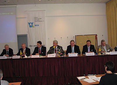 von 21: Montag, 23. Juni 2008 Mit Empörung reagierten die Teilnehmer beim Unternehmertag des Verband Verkehrswirtschaft- und Logistik Nordrhein-Westfalen e.V. (VVWL) am 21. Juni in Düsseldorf auf die vom Bundestag drei Tage zuvor beschossene Mauterhöhung. In einer Resolution forderten die 300 Delegierten ihre nordrhein-westfälische Landesregierung auf, der Erhöhung im Bundesrat ihre Stimme zu verweigern und „zusammen mit der Bundesratsmehrheit das Existenzvernichtungsprogramm zu stoppen.“(Foto: VVWL)