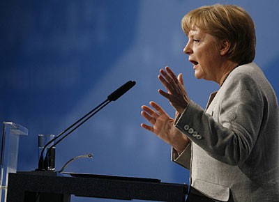 von 18: Donnerstag, 29. Mai 2008 Der Transportsektor muss dringend Maßnahmen im Kampf gegen den Klimawandel ergreifen. Dies forderte Bundeskanzlerin Angela Merkel heute auf dem Weltverkehrsforum in Leipzig. „Wir müssen die Entkoppelung von Transportleistung und Energieverbrauch schaffen“, sagte die CDU-Politikerin. Deutschland dürfe sich in einer globalisierten Welt nicht abschotten, doch offene Märkte führten zwangsläufig zu einem wachsenden Verkehrsaufkommen. „Der Klimawandel gehört zu den zentralen Herausforderungen der Menscheit“, betonte Merkel. (Foto: ddp)