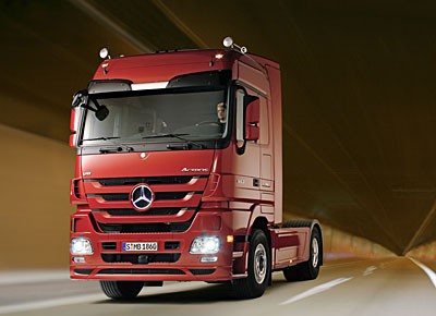 von 5: Mercedes überarbeitet den Actros MP3 eher maßvoll. Verbessert wurde vor allem dort, wo die Kunden Kritik geübt haben. Optisches Gimmick am Rande: Ein beleuchteter Mercedes-Stern.