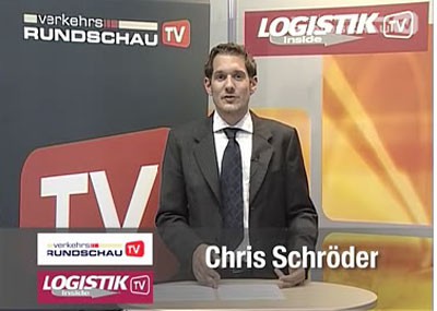 von 18: Nach dem Dreh bei DHL geht es für Chris Schröder ins LOGISTIK inside TV-Nachrichtenstudio. Das befindet sich direkt neben dem Messestand der Springer Transport Media. Der Moderator hat die Aufgabe, die Texte der Nachrichten in die Kamera einzulesen. Aus den gesprochenen Texten und den Schnittbildern werden später fertige Fernsehbeiträge.