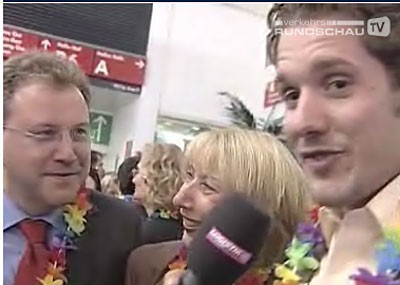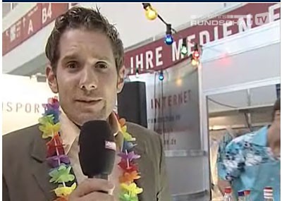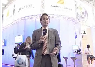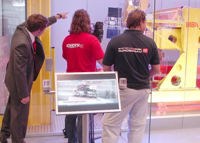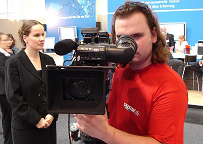 von 18: Mittwoch abend, 19:00 Uhr. Für das Web-TV-Team ist der Arbeitstag noch lange nicht beendet. Um auch von der Messe-Standparty der Springer Transport Media in bewegten Bildern berichten zu können, steht Moderator Chris Schröder ein weiteres Mal vor der Kamera. Hier schlüpft er gerade in die Rolle des Reporters ...