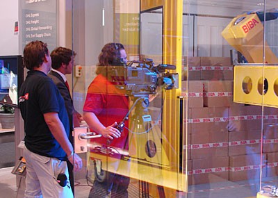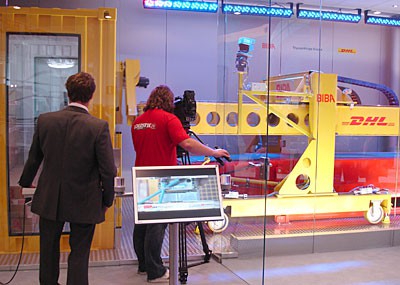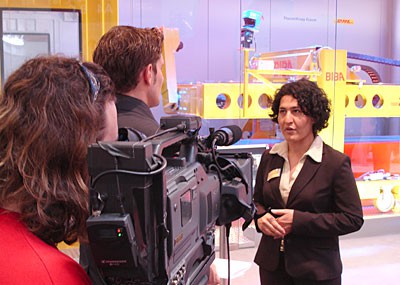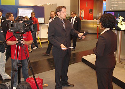 von 18: Ein Dreh steht auf dem Terminplan! Kameramann Thomas und sein Assistent nehmen den Messestand von DHL bereits genau unter die Lupe. In spätestens einer halben Stunde sollen sie Bilder von einem neuen Paket-Roboter im Kasten haben, den das Unternehmen im Rahmen der Messe erstmals vorgestellt hat. Passt das Licht? Ist noch weitere Hilfe erforderlich? Auch Moderator Chris ist gespannt. Er soll gleich am Stand von DHL ein kurzes Interview führen.