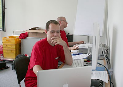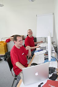 von 18: Das Team hinter dem Team: Unser eingespieltes Cutter-Duo Martin (vorne) und Rene. Kaum hat das Kamerateam alle Bilder eingefangen, lesen sie die Bilddaten in ihre Schnittcomputer ein.