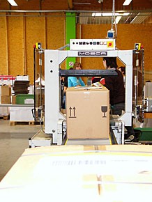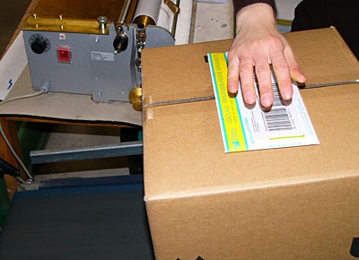 von 6: Der letzte Handgriff ist die Aufbringung des Adressumschlags mit allen Begleitpapieren. Die mobile Kaltleimmaschine im Hintergrund wird manchmal auch erst im Behälter der Wechselbrücke eingesetzt, bevor die Kartons abtransportiert werden.