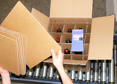 von 6: Das Flaschensortiment - neun Weinsorten aus aller Welt - und eine beigepackte Broschüre werden zum Schluss mit einem Karton als Sicherheitsschutz abgedeckt.