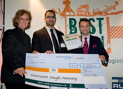 von 5: Auf dem 3. Platz: Gurneet Singh Narang (m.), Azubi bei der mittelständischen Spedition Land- & Seetransport GmbH in Hamburg. Er hatte beim Wissenstest 444 von 456 möglichen Punkten erreicht. Mit im Bild: Anita Würmser, Chefredakteurin der VerkehrsRundschau und Laudator Bernhard Simon, Sprecher der Dachser-Geschäftsführung.