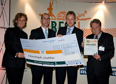 von 5: Das Losglück war ihm hold: Christoph Matthes (2. v.r.), ebenfalls Azubi bei Panalpina in Hamburg, hatte mit 448 Punkten im Wettbewerb das gleiche Ergebnis wie Marie Sillge erzielt. Da die AGB des Wettbewerbs jedoch bei Gleichstand ein Losverfahren vorgesehen hatten, profitierte er von Fortuna und schaffte es ganz nach vorne. Den Preis nahm er gemeinsam mit seinem Niederlassungsleiter Ralf Oldag entgegen. Laudator für den Sieger war der Bayerische Umweltminister Otmar Bernhard.