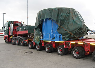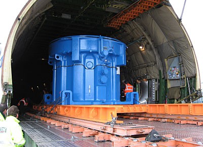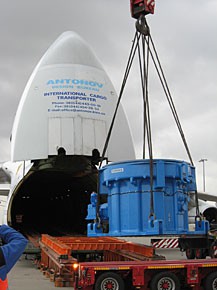 von 4: Geis SDV-Mitarbeiter bei der Verladung eines 80-Tonnen-Zementgetriebes am Flughafen Köln/Bonn. Ziel des Frachtflugzeuges Antonow 124: das indische Hyderabad.