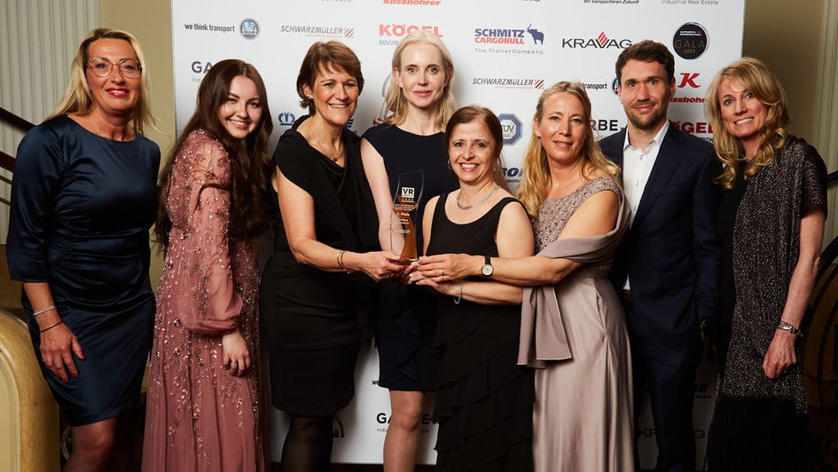 von 25: Ihr gemeinsames Projekt "Green Mobility Trainee" beschert Daimler Truck, DB Schenker, Lufthansa Cargo, Lufthansa Innovation Hub, Onomotion und Time Matters den ersten Platz in der Kategorie "Aus- und Weiterbildung" im Bereich Kooperationen. Es freuten sich (v.l.n.r.): Denise Neddermann (DB Schenker), Olga Dieser (Time Matters), Susanne Berthold-Neumann (Deutsche Lufthansa), Andrea Goemann (DB Schenker), Franca Pepe und Ariane Beckert (beide Daimler Truck), Sven Kämmerer (Lufthansa Innovation Hub) sowie Bettina Jansen (Lufthansa Cargo)