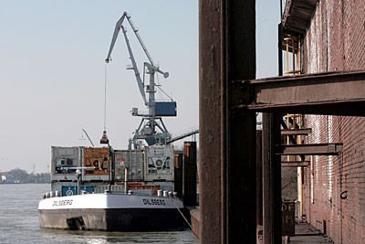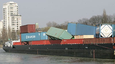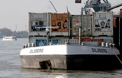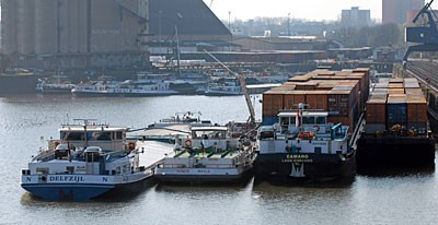 von 18: Das Unglück verursacht auf dem Rhein einen Stau: Binnenschiffe ankern zum Teil mitten auf dem Rhein und warten auf die Aufhebung der Sperrung des Rheins für den Schiffsverkehr. Die Bergung der in den Rhein gestürzten 31 Container gestaltet sich jedoch schwieriger als angenommen. (Foto: ddp)