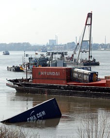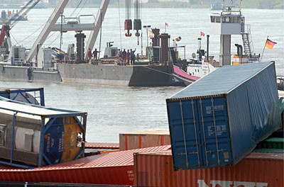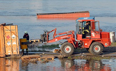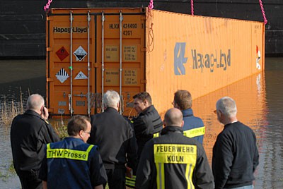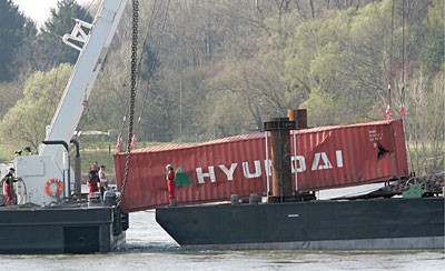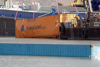 von 18: Ein Container liegt bei Köln-Porz im Rhein. Das Frachtschiff Excelsior hatte dort am 25. März bei einer Havarie über 30 Container verloren. Zur Bergung der Container musste der Fluss mehrere Tage gesperrt werden. Das Frachtschiff lief zum Teil mit Wasser voll und war nicht mehr manövrierfaehig. Erst am Abend des 30. März wurde der Fluss wieder freigegeben. (Foto: ddp)