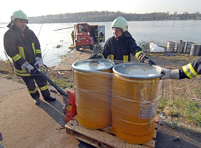 von 18: Feuerwehrleute bei der Bergung von Gefahrgut. (Foto: ddp)