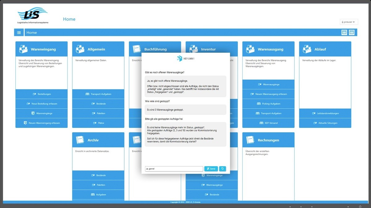 Die KI-gestützte Assistenzfunktion greift laut LIS direkt auf Live-Daten und vorhandene Dokumentation im System zu. Neben klassischen Abfragen zu Beständen oder Aufträgen lassen sich laut LIS auch einfache Datenanalysen und Auswertungen ad hoc erstellen. Damit unterstützt die KI insbesondere Leitstände, die Lagerleitung sowie operative Beschäftigte bei täglichen Entscheidungen. Ziel sei es ausdrücklich nicht, „Prozesse autonom zu steuern oder Mitarbeitende zu ersetzen, sondern sie im Arbeitsalltag gezielt zu entlasten“, betont der Anbieter.