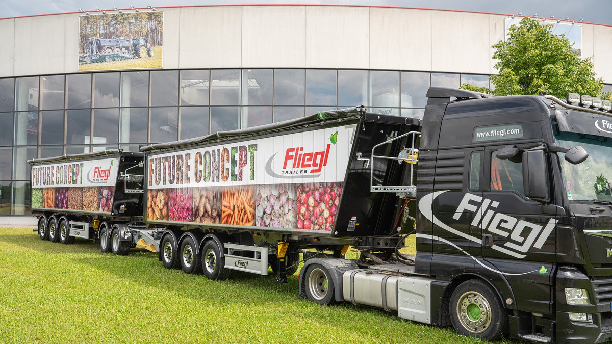 Wie kommen Mais, Rüben oder Häckselware besonders wirtschaftlich vom Feld? Fliegl hat dafür das Future-Concept auf die Räder gestellt. Dieses präsentiert der Thüringer Trailer-Spezialist auf der Landwirtschafts-Messe „Agritechnica“, die vom 9. bis zum 15. November auf dem Messegelände in Hannover stattfindet. Das „Future-Concept“ besteht aus zwei, per hauseigenem Dolly hintereinander gekoppelten, Dreiachs-Sattelaufliegern vom Typ "DHKA 390". Zwei mal 50 Kubikmeter Ladekapazität kommen zu zusammen. Und dank der Leichtbauweise der ausgestellten Greenline-Varianten bringt jeder der beiden Trailer laut Fliegl lediglich 5,8 Tonnen auf die Waage.