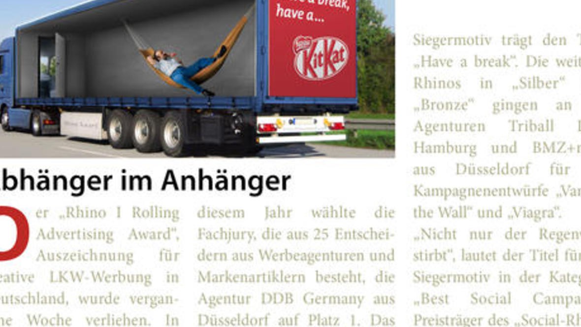 Der "Rhino I Rolling Advertising Award", Auszeichnung für kreative LKW-Werbung in Deutschland, wurde vergangene Woche verliehen. In diesem Jahr wählte die Fachjury, die aus 25 Entschei-dern aus Werb...