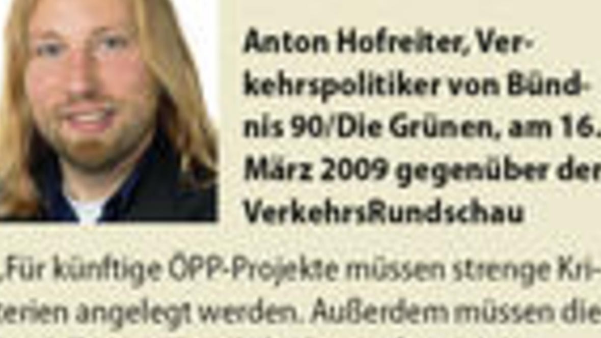 „Für künftige ÖPP-Projekte müssen strenge Kriterien angelegt werden. Außerdem müssen die Modelle grundsätzlich überprüft werden.“ Anton Hofreiter, Verkehrspolitiker von Bündnis 90/Die Grünen, am 16. M...