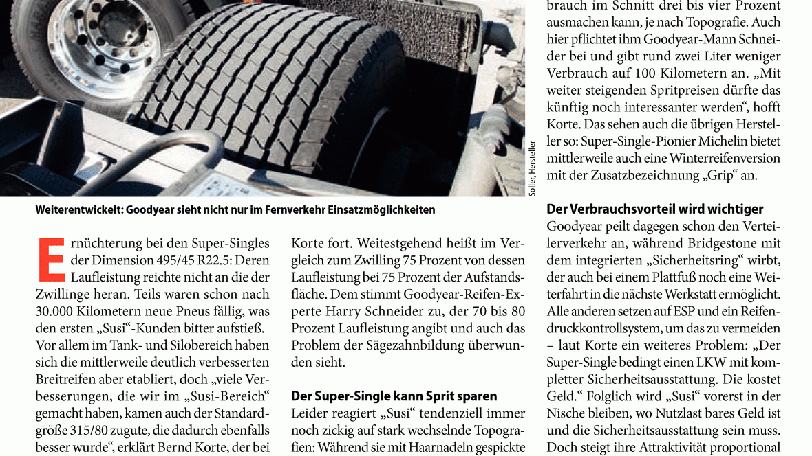 Rund fünf Jahre nach der Einführung der ersten Super- Single-Reifen, führen die ein Dasein in der Nische. Wo Werte wie Gewicht und Verbrauch zählen, haben sie sich jedoch mittlerweile fes...