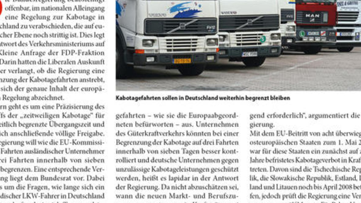 Völlige Freigabe oder konsequente Beschränkung: EU-Kommission, Europäisches Parlament und Bundesregierung streiten über die Zukunft der Kabotage. Die Bundesregierung beabsichtigt offenbar, im nation...