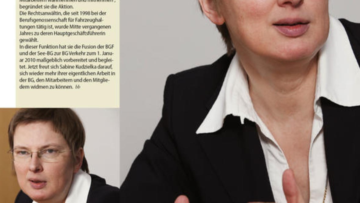Die BG Verkehr hat rund 200.000 versicherte Unternehmen Zur Person Sabine Kudzielka geboren am 26. Oktober 1961 in Hamburg, ist eine Praktikerin. Vom grünen Tisch aus zu agieren ist nicht ihr Stil,...