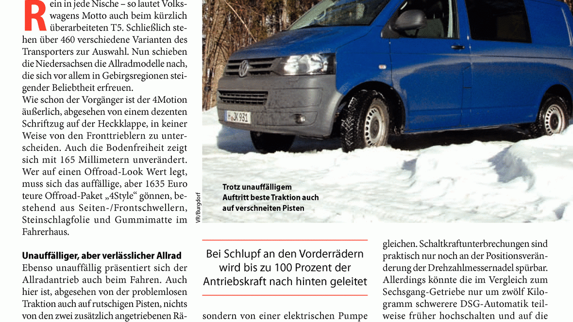 Kurz nach Markteinführung des überarbeiteten Trans-porters schiebt VW den T5 4Motion nach. Die Allradtechnik wurde verfeinert. Nach wie vor ist der Allradler nur an seinen inneren Werten erkennbar. ...