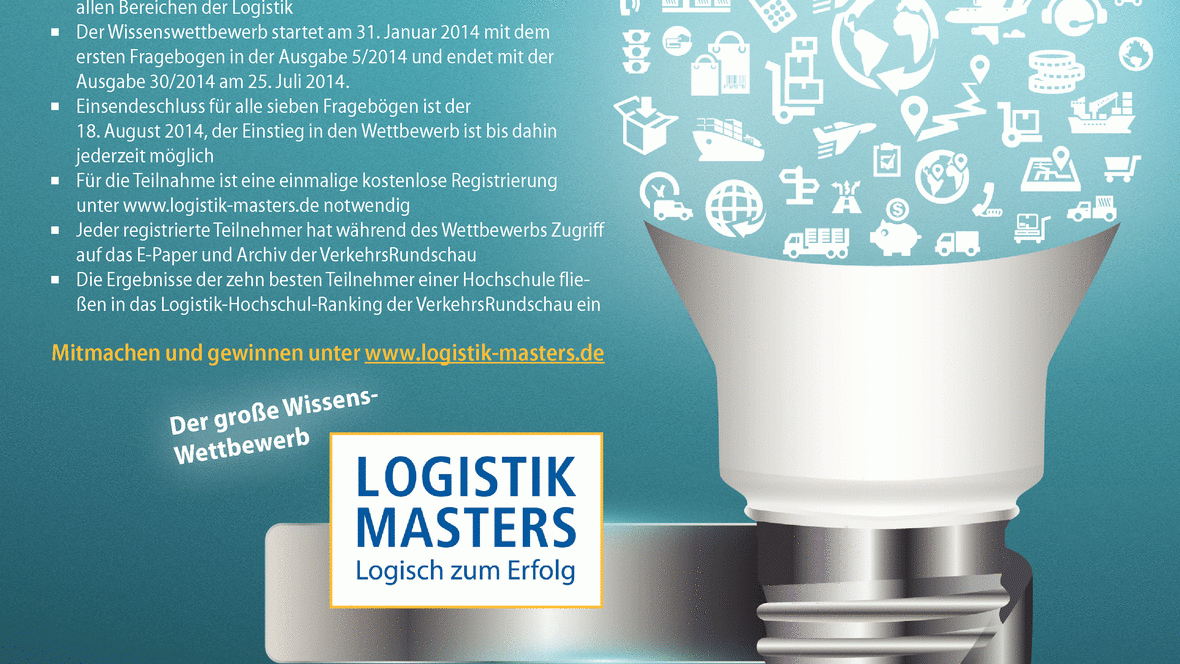 Mach mit beim Studenten-Wettbewerb LOGISTIK MASTERS. Der große Wissens-Wettbewerb Die Hauptgewinne: Die drei besten Teilnehmer von Logistik Masters 2014 erhalten Preisgelder im Gesamtwert von 10...
