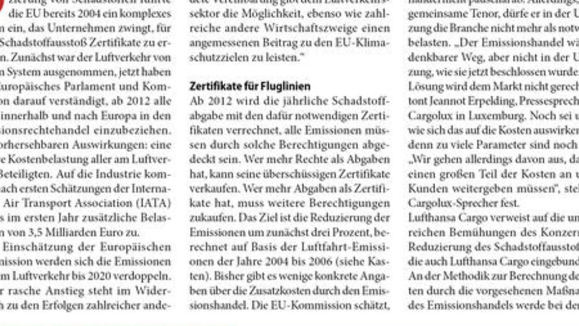 der Welt Nun ist es beschlossene Sache: Ab 2012 soll der Luftverkehr in den Emissionshandel für Kohlendioxid einbezogen werden. Die Industrie fürchtet erhebliche Mehrkosten. Die Schonfrist ist vo...