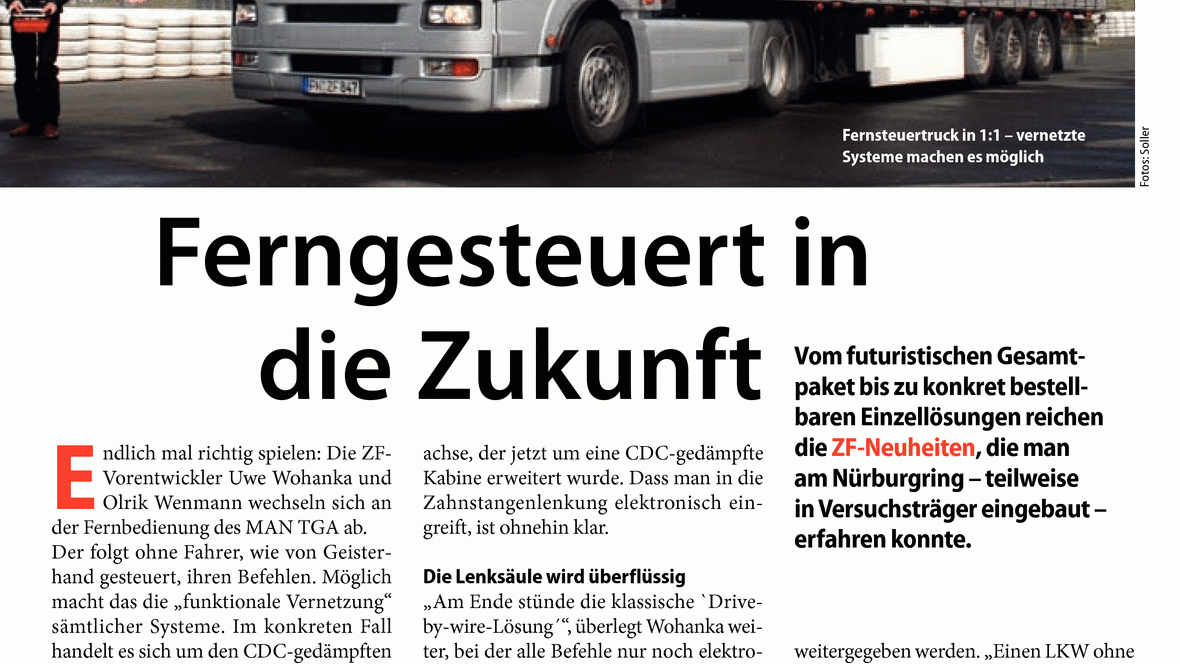 Fernsteuertruck in 1:1 – vernetzte Systeme machen es möglich die Zukunft Vom futuristischen Gesamt-paket bis zu konkret bestell-baren Einzellösungen reichen die ZF-Neuheiten, die man am Nürburgring...