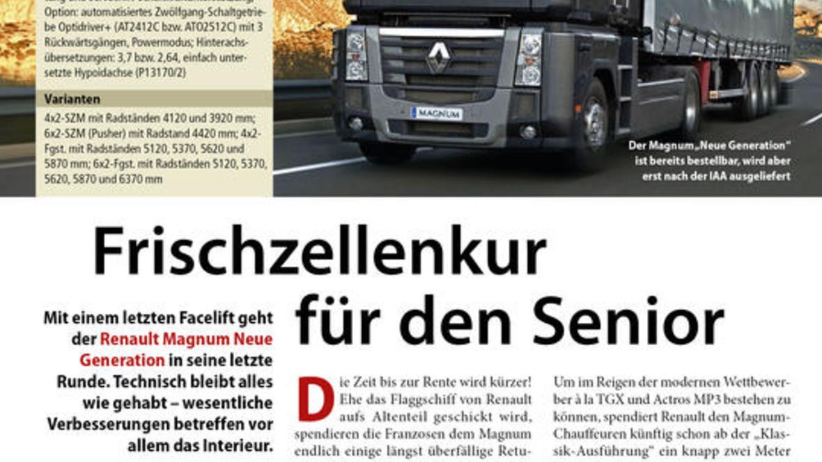 Der Magnum "Neue Generation" ist bereits bestellbar, wird aber erst nach der IAA ausgeliefert Mit einem letzten Facelift geht der Renault Magnum Neue Generation in seine letzte Runde. Technisch blei...