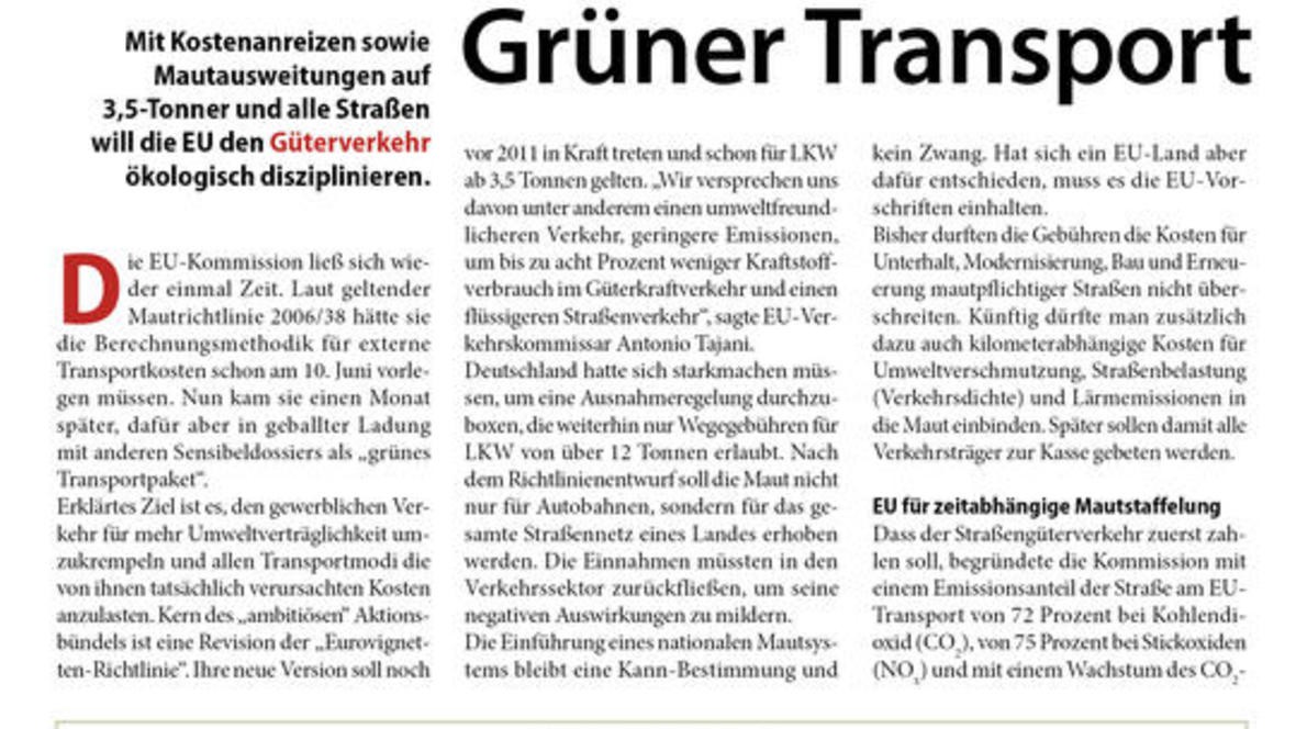 Mit Kostenanreizen sowie Mautausweitungen auf 3,5-Tonner und alle Straßen will die EU den Güterverkehr ökologisch disziplinieren. Die EU-Kommission ließ sich wieder einmal Zeit. Laut geltender Mautr...