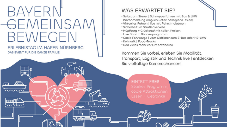 Am Samstag, den 18. Oktober 2025, lädt der Hafen Nürnberg von 10:00 bis 16:00 Uhr zum Aktionstag „Bayern gemeinsam bewegen“ ein. Veranstaltet wird das Event vom Bayerischen Staatsministerium für Wohnen, Bau und Verkehr gemeinsam mit zahlreichen Verbänden und Institutionen der Branche.