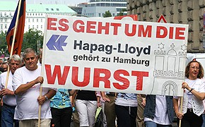 Hamburg. Zum dritten Mal binnen weniger Wochen sind am Mittwochvormittag die Mitarbeiter in der Hamburger Hapag-Lloyd-Unternehmenszentrale auf die Straße gegangen. Im Anschluss an eine Betriebsversammlung, an der rund 400 Beschäftigte teilnahmen, zogen die Angestellten in die Hamburger Innenstadt. Die neuerliche Protestveranstaltung stand unter dem Motto „Es geht um die Wurst – Hapag-Lloyd gehört zu Hamburg". Mit der Aktion wollten die Mitarbeiter erneut ihre große Sorge über die Zukunft des Traditionsunternehmens und damit um den Erhalt ihrer Arbeitsplätze zum Ausdruck bringen. Entsprechend blumig, aber auch deutlich fielen die Texte auf den mitgeführten Transparenten aus. „Wer schmückt das Tor zur Welt, wenn Hapag-Lloyd wegfällt“, hieß es beispielsweise auf einem Protestplakat. Inzwischen ist die Frist für die Abgabe von Kaufgeboten an die Hapag-Lloyd-Muttergesellschaft TUI verstrichen. Uwe Klein, Betriebsratsvorsitzender des Schifffahrtskonzerns am Standort Hamburg, begründete den erneuten Protest auch damit, dass das klare Eintreten der Mitarbeiter für einen Verbleib der Reederei in Deutschland sowohl die Großaktionäre als auch die „TUI-Chefs“ noch nicht vollständig überzeugt habe. Deshalb müsse man noch etwas nachsetzen. Da es mit dem Erreichen der Gebotsfrist nun „richtig ernst wird, wollen wir auch ein knackiges, hamburgisches Zeichen setzen“, so Klein. „Jetzt geht’s um die Wurst.“ Deshalb gab es am Zielpunkt des Protestmarsches für jeden Hapag-Lloyd-Mitarbeiter eine frische Bratwurst. Wolfgang Rose, Landeschef Hamburg der Dienstleistungs-Gewerkschaft Verdi, hob gegenüber der VerkehrsRundschau die Wirkung dieser Aktion auch auf die Bürger der Hansestadt sowie die Politik und potenzielle Investoren hervor. „Diese Aktion zeigt, dass die Mitarbeiter sich sehr stark mit diesem Standort, mit Hapag-Lloyd in Hamburg, identifizieren. Das ist ein wesentlicher Produktivitätsfaktor für ein Unternehmen. Deswegen sollte diesen Aspekt keiner unterschätzen.“ Er gab weiter zu verstehen, dass er die Übernahme der Reederei durch eine Hamburger Investoren-Gruppe für den einzig machbaren Weg hält. Zugleich sprach er sich dafür aus, dass sich auch die Bundesregierung für den Erhalt der Reederei in Deutschland einsetzt. Inzwischen hat sich in der Elbe-Stadt auch eine Bürgerinitiative gegründet, die sich für den Erhalt der Reederei in Hamburg einsetzen. Das Motto der Vereinigung ist klar: „Hamburg ohne Hapag-Lloyd – das wäre wie ein Hafen ohne Schiffe.“ Die Bürgerinitiative setzt sich dafür ein, dass der Schifffahrtskonzern im Rahmen einer „Hamburger Lösung“ von der TUI erworben wird. „Hapag-Lloyd ist ein intaktes und erfolgreiches Unternehmen, integriert in eine florierende Hafenwirtschaft. Das soll so bleiben“, lautet die Forderung der Bürgerinitiative. (eha)