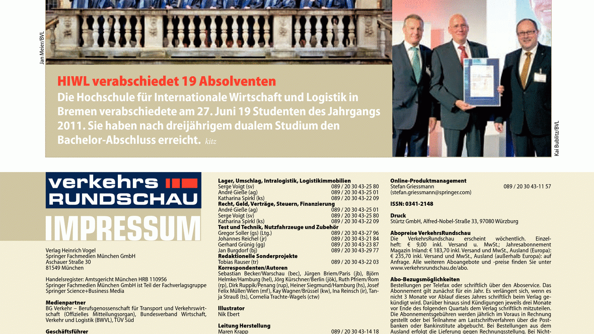 Die Hochschule für Internationale Wirtschaft und Logistik in Bremen verabschiedete am 27. Juni 19 Studenten des Jahrgangs 2011. Sie haben nach dreijährigem dualem Studium den Bachelor-Abschluss erreic...