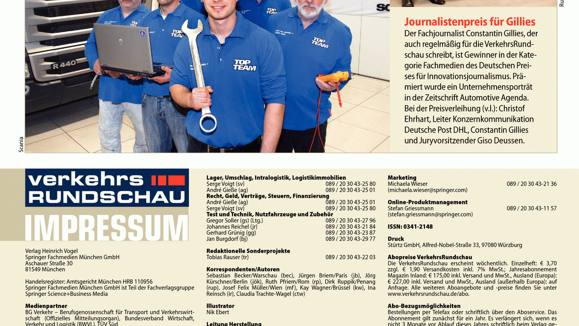 Journalistenpreis für Gillies Der Fachjournalist Constantin Gillies, der auch regelmäßig für die VerkehrsRundschau schreibt, ist Gewinner in der Kategorie Fachmedien des Deutschen Preises für Innovat...