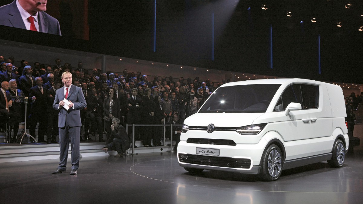 Lieferwagen der Zukunft Beim Genfer Autosalon präsentierte Eckhard Scholz, Sprecher des Vorstands von Volkswagen Nutzfahrzeuge, die Studie E-Co-Motion. Der elektrisch angetriebene Lieferwagen ...