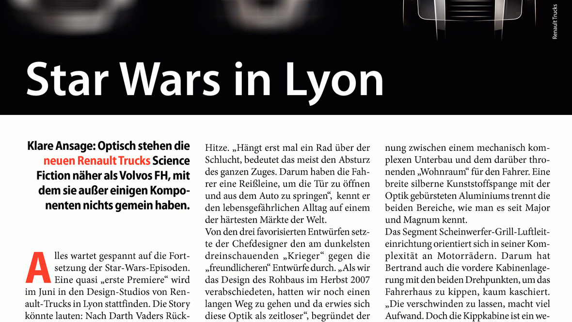 Star Wars in Lyon Klare Ansage: Optisch stehen die neuen Renault Trucks Science Fiction näher als Volvos FH, mit dem sie außer einigen Komponenten nichts gemein haben. Alles wartet gespannt auf die ...