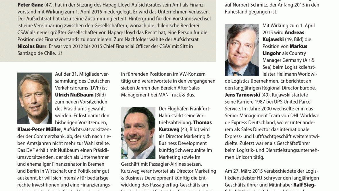 Peter Ganz (47), hat in der Sitzung des Hapag-Lloyd-Aufsichtsrates sein Amt als Finanzvorstand mit Wirkung zum 1. April 2015 niedergelegt. Er wird das Unternehmen verlassen. Der Aufsichtsrat hat dazu ...