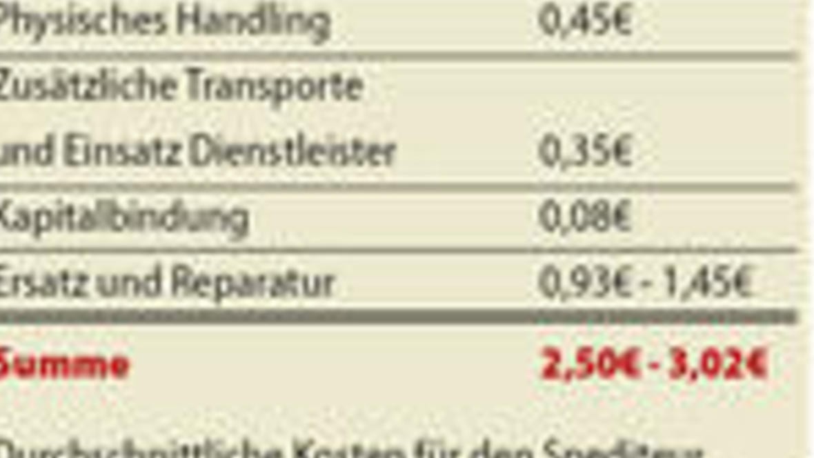 Administration 0,69€ Physisches Handling 0,45€ Zusätzliche Transporte und Einsatz Dienstleister 0,35€ Kapitalbindung 0,08€ Ersatz und Reparatur 0,93€ - 1,45€ Summe 2,50€ - 3,02€ Durchschnittliche...