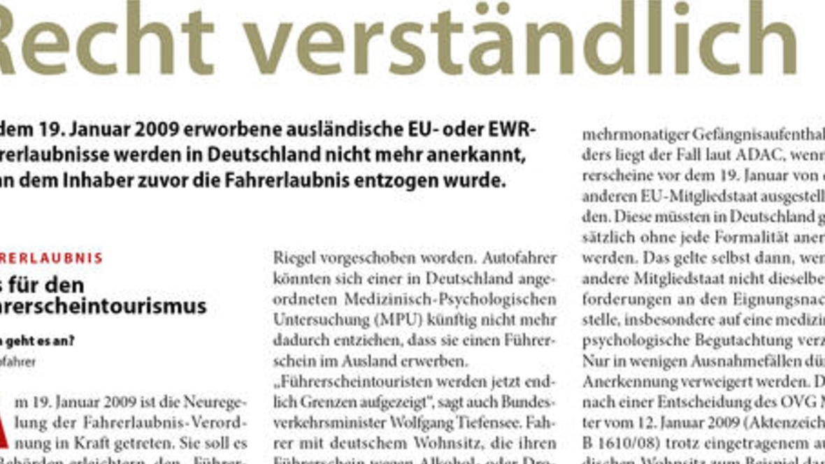Ab dem 19. Januar 2009 erworbene ausländische EU- oder EWR-Fahrerlaubnisse werden in Deutschland nicht mehr anerkannt, wenn dem Inhaber zuvor die Fahrerlaubnis entzogen wurde. Aus für den Führersc...