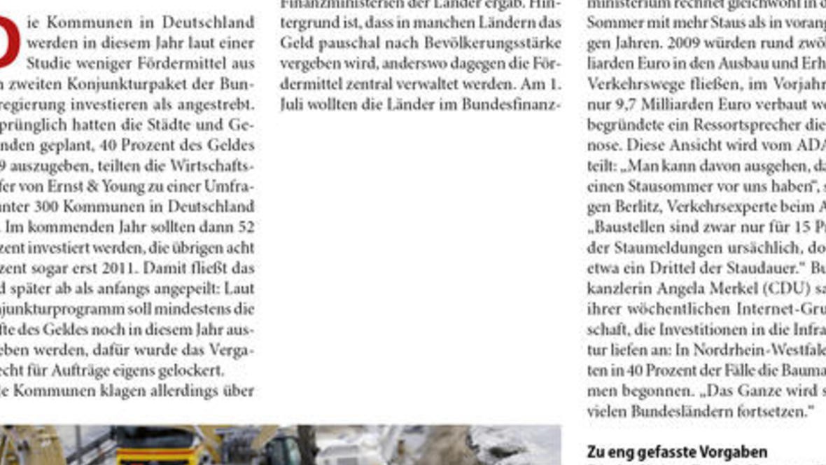Die Gelder aus dem milliardenschweren zweiten Konjunkturpaket der Bundesregierung fließen langsamer als geplant. Indes fordern Verbände mehr Mittel für den Straßenbau. Die Kommunen in Deutschland we...