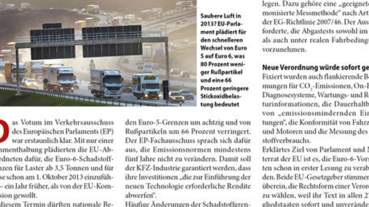 Die EU-Verkehrsparlamentarier drängen darauf, die verschärfte LKW-Abgasnorm Euro 6 ein Jahr früher als geplant einzuführen. Das Votum im Verkehrsausschuss des Europäischen Parlaments (EP) war erstau...