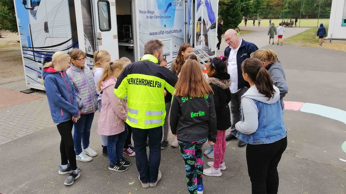 SiFat Road Safety hat für die Verkehrserziehung der Schüler einen Lkw und einen Lkw-Profi-Simulator samt Trainern kostenlos zur Verfügung gestellt. Das erste Training fand an einer Grundschule in Friedrichshain statt, das zweite an einer Schule in Neukölln. Dabei haben Schüler der Klassen fünf und sechs jeweils in Kleingruppen an zwei Stationen gearbeitet – am Lkw und im Simulator. Nachmittags wurden auch die Lehrer der Schule trainiert. Alle haben am Lkw erlebt, wann ein Lkw-Fahrer andere Verkehrsteilnehmer nicht wahrnehmen kann, weil sie sich im „Toten Winkel“ befinden. Im Simulator können sie zusätzlich erleben, was ein Lkw-Fahrer alles zu tun hat und beachten muss, wenn er sein Fahrzeug durch die Straßen steuert und wie leicht er andere Verkehrsteilnehmer dabei übersehen kann. Mit den Kindern werden danach bestimmte Verhaltensweisen geübt, die ihnen helfen können, Kollisionen mit Lkw – vor allem beim Abbiegen – zu vermeiden.