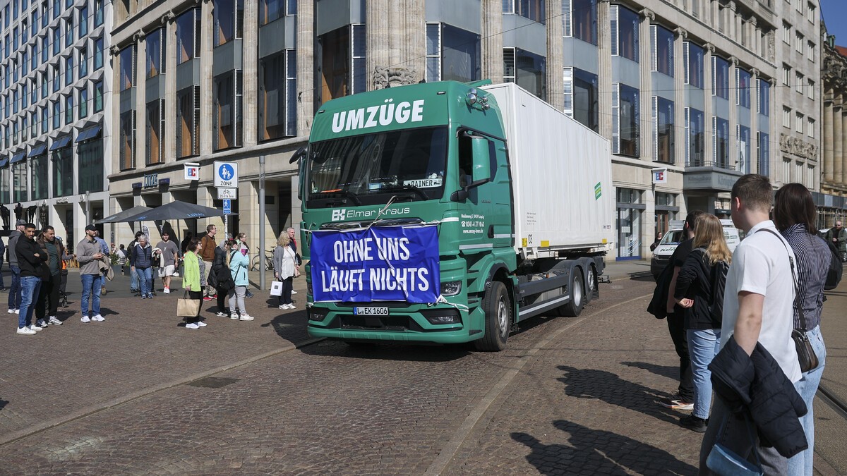 Ein Umzugs-Lkw mit einem Banner „Ohne uns läuft nichts“ fährt im Rahmen einer Protestveranstaltung gegen die hohen Kraftstoffkosten am 17. April 2026 über den Leipziger Augustusplatz